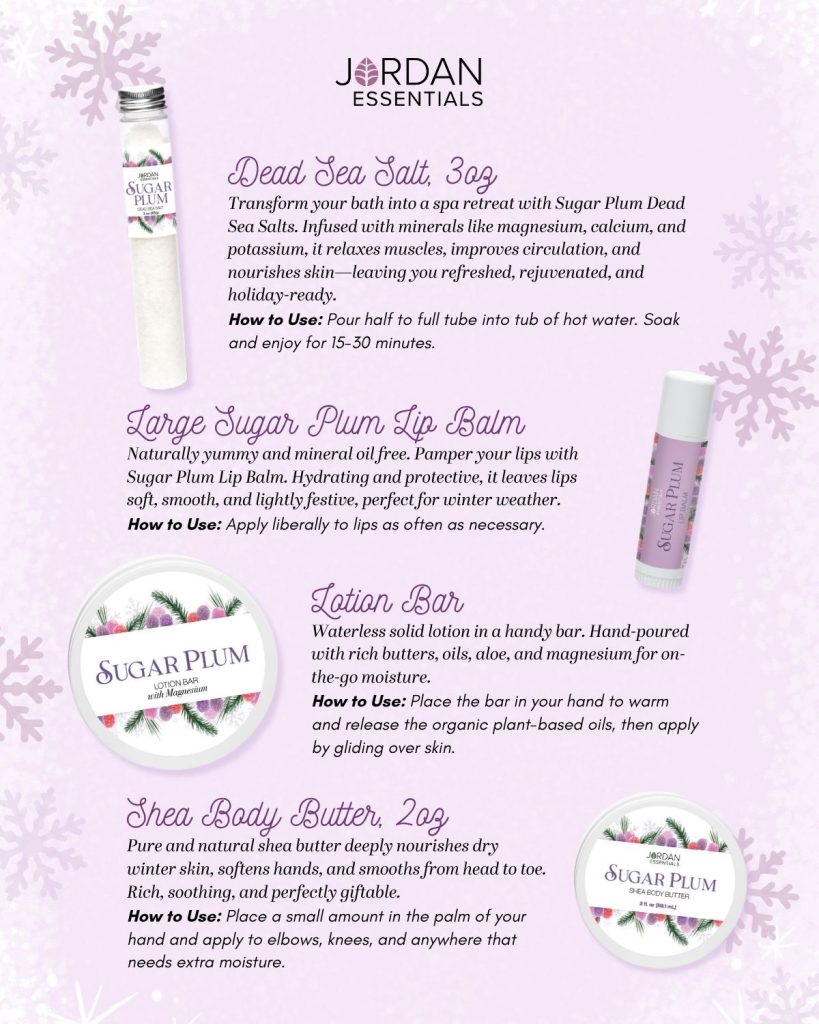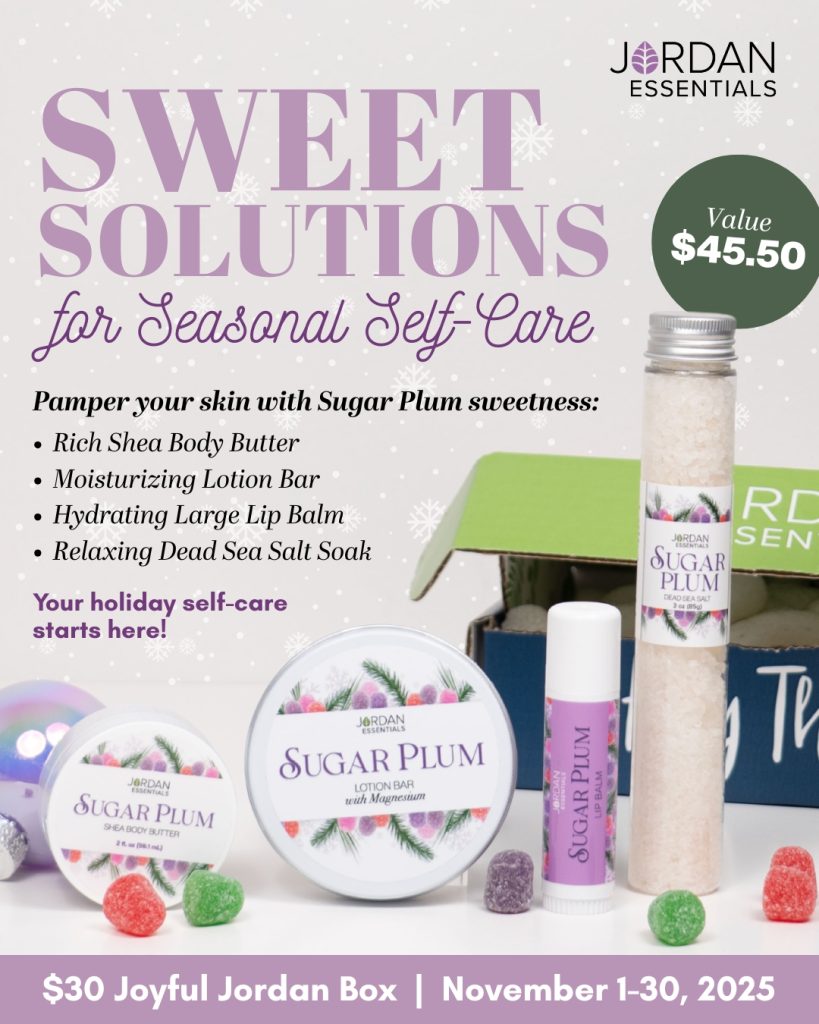 The holidays are here, and self-care is officially in season! π This monthβs Joyful Jordan Box delivers the sweetest solution for glowing skin and stress-free gifting β all in our limited-edition Sugar Plum fragrance.